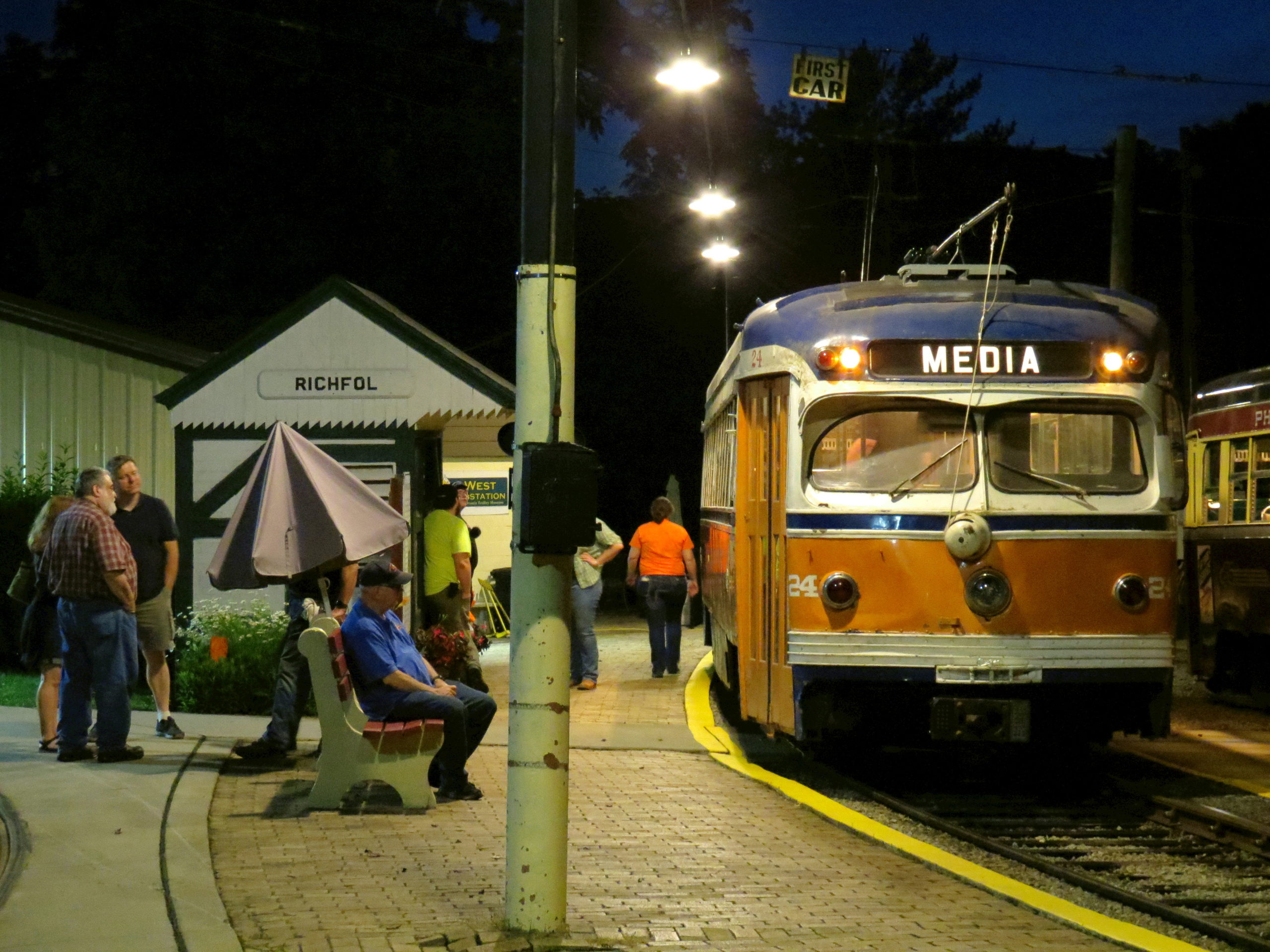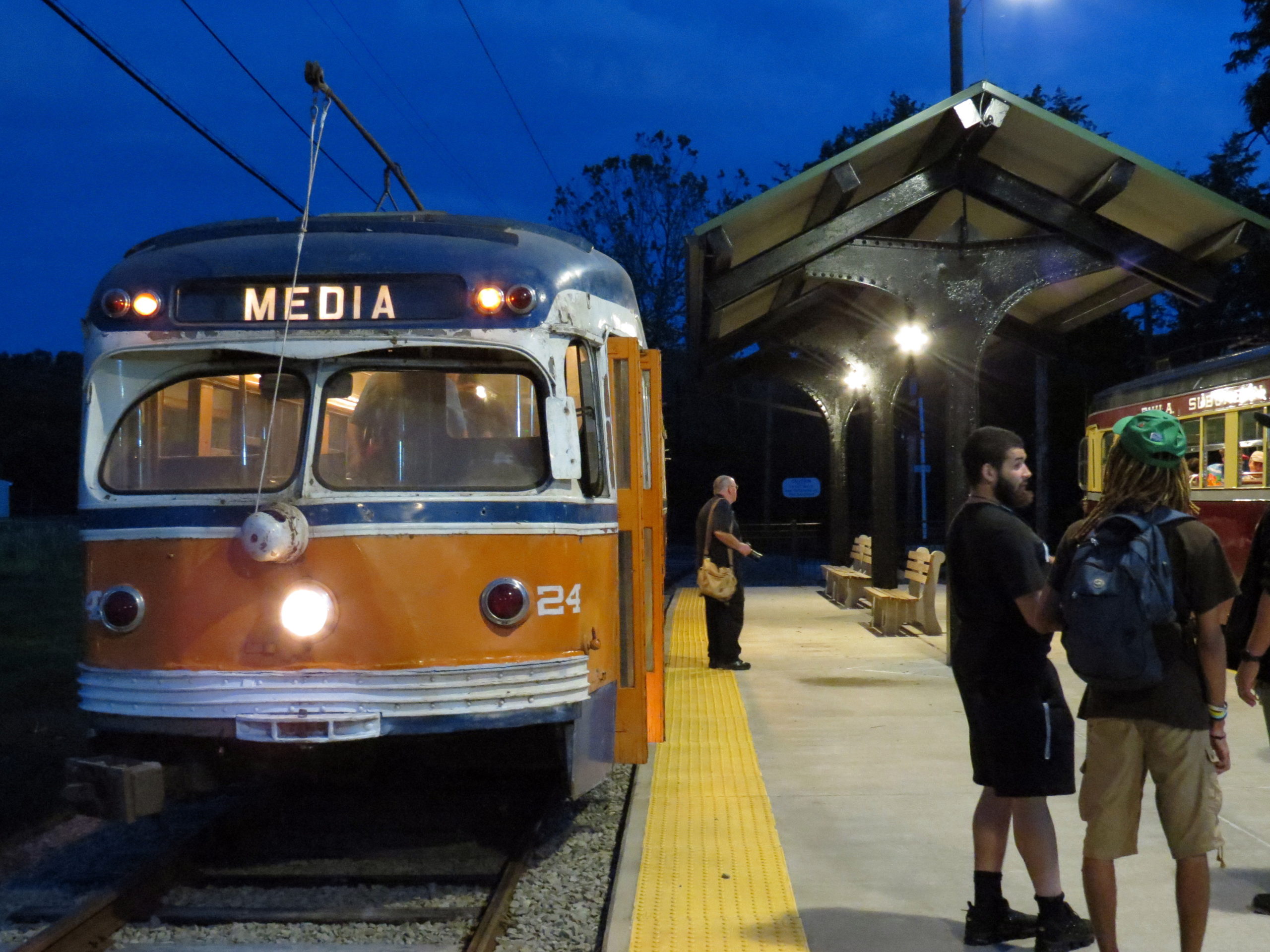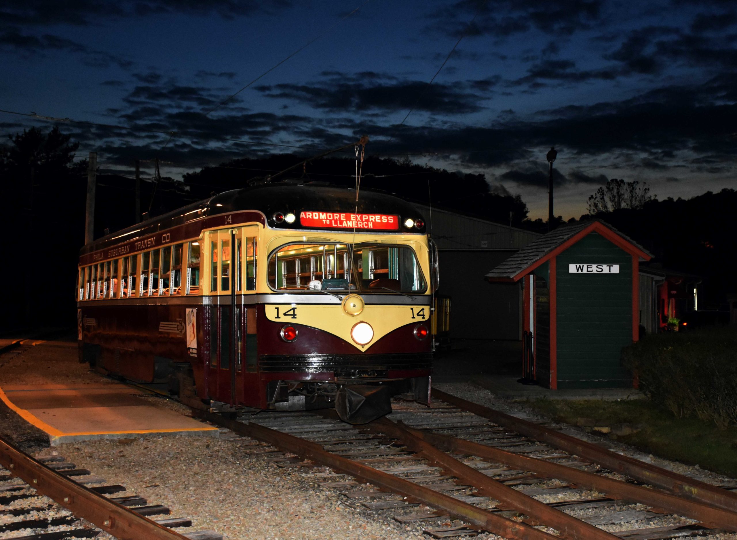 Red Arrow St. Louis cars 24 and 14 pose for photographers at twilight opposite Richfol shelter. Roger DuPuis photo.
